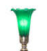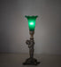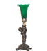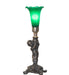 Recreating the famous Tiffany design from the early 1900s. This mini lamp features a stunning shade mouth blown of Green Favrile-style art glass. The Pond Lily shade is embraced by an elegant cast metal base featuring a charming cherub finished by hand in Antique Brass. This lamp is ideal for illuminating picture windows, credenzas, and desktops in fine homes and hotels from Buffalo-Cheektowaga, New York, to the Providence-Warwick, Rhode Island region. The Pond Lily Mini Lamp is included in our American-designed, handcrafted Favrile Glass Collection. UL and cUL listed for dry locations. Each shade is a unique work of art with color variations based on natural ingredients inherent in the glass.