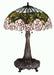 A wreath of full blooming Passion Pink cabbage roses circle this beautiful stained glass shade in a design inspired by the Louis Comfort Tiffany studio. Bronzed Green leaves and stems form a pattern against an Opal sky in this lovely Mahogany Bronze finished table lamp.