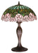 A wreath of full blooming Passion Pink cabbage roses circle this beautiful stained glass shade in a design inspired by the Louis Comfort Tiffany studio. Bronzed Green leaves and stems form a pattern against an Opal sky in this lovely Mahogany Bronze finished table lamp.