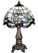 Grace your home with this elegant crowned shade, featuring a gridwork of Opal Iridized glass, adorned with a Plum colored border of swirling ribbons and perfect Ice Pink rosebuds. The Tiffany style stained glass mini lamp is made of hand cut and copperfoiled glass and is paired with a Mahogany Bronze, hand finished lamp base.