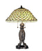 Diamond patterns of Iridized Ivory and Ivy Green are accented all over with sparkling clear jewels droplets in this elegant Victorian style shade. The versatile stained glass shade is created using copperfoil construction, a process developed by Louis Comfort Tiffany. The table lamp base is hand finished in a warm Mahogany Bronze.