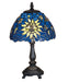 In a Celestial Blue glass sky, a Solar Yellow sun watches over the moon and the stars. Sparkling Citrine like jewels accent the hand crafted copper foiled stained glass shade. This charming Meyda Tiffany original mini lamp is hand finished in Mahogany Bronze.