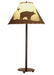 A Northwood scene, featuring pines and bear, silhouetted on parchment paper shades, enhance this Mahogany Bronze finished table lamp. The hand painted shades are wrapped in rawhide to complete the rustic look.