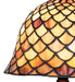 A Louis Comfort Tiffany studio classic fishscale pattern reproduced in variegated Tortoiseshell of Ambers and Burgundy. This handsome stained glass shade is used with a Mahogany Bronze hand finished lamp base. A versatile mini lamp to complement any color or style.