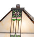 Sparkling deep brown root beer glass frames surround an arts and crafts-inspired plum-colored rose with cottage green leaves and accents, and a cornerstone beige background. The copper-foiled shade is supported by a hand-painted hammered mahogany bronze base in this classic table lamp.
