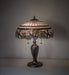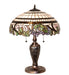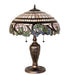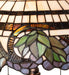 Swirling vines of translucent Plum and Multicolored stained glass surround Jade Green leaves, Pink Blush blossoms, and Amethyst Ice grape clusters that form an irregular edge on this banded Ivory colored shade. This Handel & Company reproduction shade is created using the famous Meyda Tiffany copperfoil construction technique and complemented with a Mahogany Bronze finished base. The lamp is ideal for placement in picture windows, desks, and credenzas in homes from Jersey City, New Jersey to Lincoln, Nebraska. The Handel Grapevine Table Lamp is included in our American-designed, handcrafted Stained Glass Lighting Collection. UL and cUL listed for dry locations. Each shade is a unique work of art with color variations based on natural ingredients inherent in the glass.