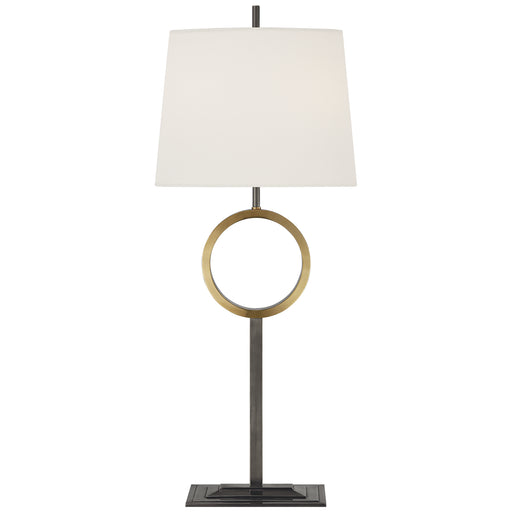 Simone Medium Buffet Lamp in Bronze and Hand-Rubbed Antique Brass with Linen ShadeDetails:Product Type: Candlestick LampFinish: Bronze with Antique...