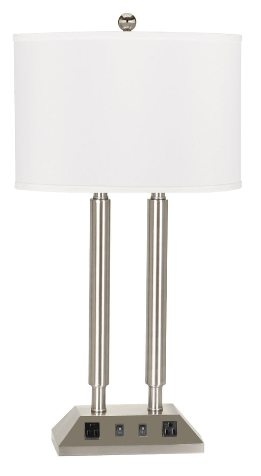 60W X 2, 2 Rocker Sw, 1 OutletDetails:Product Type: Table LampsFinish: Brushed SteelShade: WhiteRooms: Bedroom, Office, Living RoomMeasurements:Wid...