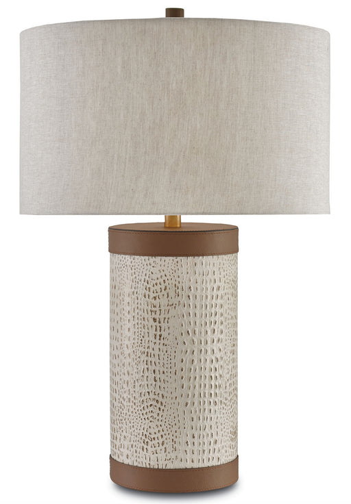 Beautiful genuine leather embossed with a crocodile pattern wraps the column of the Baptiste Table Lamp. The cylinder is capped at both ends with r...