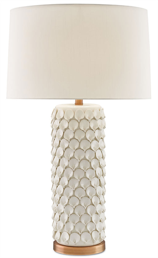 Intricate hand-formed ceramic flower petals cover the surface of the Calla Lily Table Lamp. The textural interest of the petal-covered column is he...