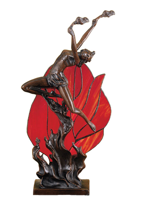 A Scarlet stained art glass flame lights up the background of this accent lamp that features a torch wielding dancer jumping above the fiery flames...