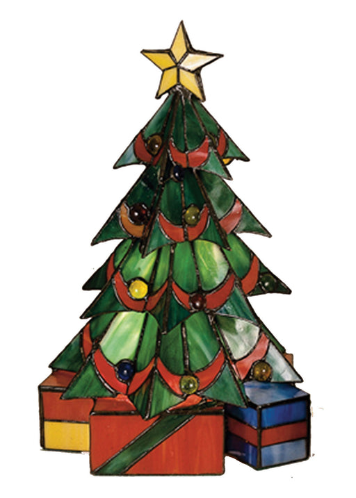 This festive holiday Christmas Tree accent lamp, crafted of Holiday Red and Pine Green stained art glass with Yellow, Blue and colorful jewel accen...