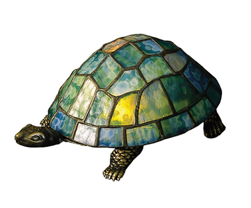 A Land Turtle is transformed into a charming accent lamp featuring a mottled Blue Green stained glass shade resting on a cast metal base.Details:Pr...