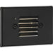 The LED Step/Wall Light finished in classic black offers an elevated look to exterior architectural styles, whether residential or commercial. A horizontal and a vertical exterior face plate are provided to accommodate either a horizontally or vertically oriented installation. The step light features an integrated photocell with automatic dusk to dawn operation, automatically turning the fixture on and off at sunset and sunrise, eliminating the need for additional controls. The photocell and LED assembly is enclosed in a gasketed lens, allowing it to meet the rigorous demands of wet location use. The louvered face plates direct the light downwards to minimize glare and clearly illuminate stairs, walls, and walkways, resulting in performance, cost and safety benefits. It is cCSAus wet location rated for use in areas with direct water contact. .