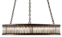 The Elixir Chandelier is composed of a wrought iron frame in a dynamic bronze verdigris and solid optic crystal cylinders. As light passes through the material, a dazzling effect is produced resulting in repetitious illumination from this glass chandelier.