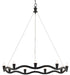 Our Serpentina Chandelier is made of wrought iron in an antique black finish. The lightness of this design stems from the aircraft cable that suspends the serpentine bottom ring from the plumb bob-like top cap on this black chandelier.