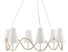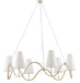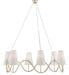 Our Kadir Chandelier is made of wrought iron in a silver Granello finish. The wave-like ring that holds the off-white linen shades covering the six lights is ornamented with tiny globes where the hardware meets the band. The silver chandelier illustrates the talent our artisans have for creating gleaming finishes.