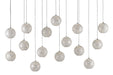 The Finhorn Rectangular 15-Light Multi-Drop Pendant has orb-shaped shades covered with small squares of mother of pearl, painstakingly hand-applied. The canopy of this piece is luminous in a painted silver finish. This fixture is among Currey & Company's multi-drop pendant collection, which includes multiple configurations.