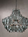 The Galahad Chandelier has recycled glass and recast glass discs that are individually attached by hand to hang from its immense wrought iron frame finished in bronze. The size of this twelve-light glass chandelier is impressive, as are the reflected hues that glint through the recycled discs that make up the shade.