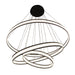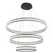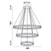 Multiple white acrylic pieces form rings of LED light accented by black trim. The small detail in the halos add dimension and texture to the otherwise simple form. The dark edges create a slight rustic appearance to the overall design adding character and a soft industrial quality. Varied sizing offers 1-tier or 3-tier options