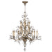 Chandelier in an antique taupe finish with silver leafed accents featuring antique candlesticks and stylized faceted crystal leaves.