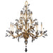 Chandelier in antique warm gold leaf featuring antique candlesticks and stylized faceted crystal leaves.