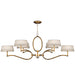 Oblong chandelier in a burnished gold leaf finish with subtle brown highlights and white textured linen shades with pierced metal gallery in matching gold leaf finish.
