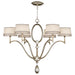 Chandelier in a platinized silver leaf finish with subtle brown highlights and white textured linen shades with pierced metal gallery in matching silver leaf finish.