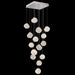 Inspired by one of the largest asteroids in our solar system that continuously orbits the outer reaches of space. Its rocky form has been punished over billions of years since the early formation of our planets. Our glass artisans have recreated this celestial form using a unique technique of freehand glassblowing that creates a ghostlike illumination through the white colored glass. Each handblown, sculptural piece is a unique work of contemporary art hanging from a silver leaf canopy. Approximate blown glass drop dimensions: 5.5"W x 6.5"H.