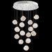 Inspired by one of the largest asteroids in our solar system that continuously orbits the outer reaches of space. Its rocky form has been punished over billions of years since the early formation of our planets. Our glass artisans have recreated this celestial form using a unique technique of freehand glassblowing that creates a ghostlike illumination through the white colored glass. Each handblown, sculptural piece is a unique work of contemporary art hanging from a silver leaf canopy. Approximate blown glass drop dimensions: 5.5"W x 6.5"H.