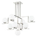 Large opal glass metal-capped globes are mounted on perfectly perpendicular metal arms creating this geometric masterpiece. Available as a sconce, a large-scale chandelier, a close-to-the-ceiling flush mount or a spectacular island piece, this fixture will occupy the room and fill it with a clean, fresh look.