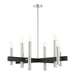 The dramatic lines of the Helsinki collection remind of early modern Scandinavian style. The massive candles rise on the contrasting bar at different heights dynamically emulating the shape of a city skyline. This eight-light exposed bulb chandelier comes in a brushed nickel finish accented with black finish bars. Great for any space where dramatic statement is needed such as a foyer, dining room, living room or bedroom.