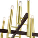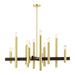 The dramatic lines of the Helsinki collection remind of early modern Scandinavian style. The massive candles rise on the contrasting bar at different heights dynamically emulating the shape of a city skyline. This twelve-light exposed bulb chandelier comes in a satin brass finish accented with bronze finish bars. Great for any space where dramatic statement is needed such as a foyer, dining room or living room.