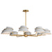 Metal shades of Light French Gray are suspended from halos of Natural Aged Brass. Maximizing the light output, the interior of the shades are painted white and their tops are left open casting light both upwards and below. The collection is completed by a delightful pull-chain operated wall sconce that provides a practical light source ideal for a reading nook or bedside.