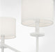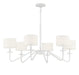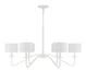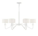 This 6-light chandelier changes up the traditional chandelier shape with long, thin arms that are more dramatically stretched, each topped with a shade of white fabric. Finished in bisque white. 18" height, 42" width. Uses candelabra size bulbs, max 60 watts per bulb. LED bulb compatible.