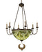 Bands of hieroglyphs and hawks, finished in Mahogany Bronze, accent shades of Nile Green and Oasis Blue glass. Inspired by art and architecture of ancient Egypt, our and scarab adorned six light chandelier emulates treasures of the Pharos.