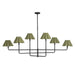 The Polly Chandelier embodies grace and versatility with its six shades, delicately crafted from green linen and sewn into a charming scalloped pattern. Its multi-tiered design, coupled with Blackened Brass rotatable arms, offers flexibility in configuration, allowing for linear arrangements or coverage over a round dining table.