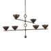 Inspired by the work of renowned Italian artist Alberto Giacometti, the Vishal family makes an impact with its sculptural framework and heavily patinated finish. The shades resemble dishes filled with light while the spindly arms are accented by ornamental circular motifs. The allover Black Patina Gold finish continues the art historical reference, adding an organic, hand-applied, and weathered effect. Vishal is available as a 1-light sconce and 4 or 6-light chandelier.