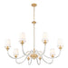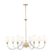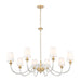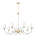 Elegant touches of rich rubbed brass finishing create warmth and contrast for this modern eight-light chandelier. Delicate glass arms are curved and slim, offering refined flair to a familiar silhouette. Lights are capped with white fabric shades, each with a slight taper for added elegance.