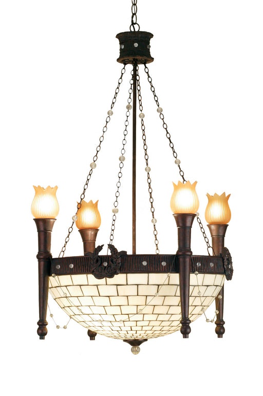 This regal chandelier offers an inverted stained glass shade featuring a Beige brick patterned background. This handsome fixture is crafted with a ...