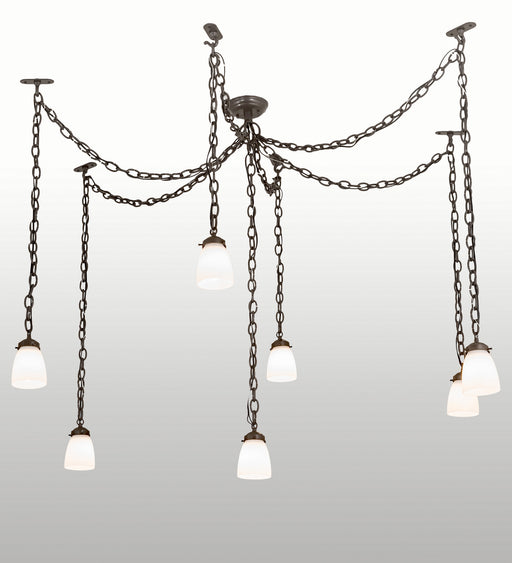 The elegant Castilian Pendant will grace any residential, hospitality or commercial space. Seven White Opalescent Glass shades are draped from chai...