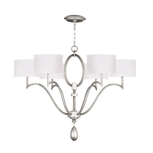 Chandelier in a silver leaf finish with white fabric shades.Details:Product Type: Drum ShadeFinish: SilverShade: WhiteDesigner: Fine Art Handcrafte...