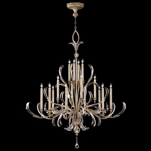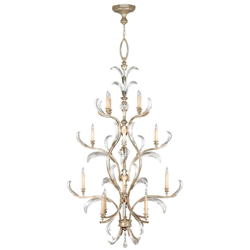 Oblong chandelier in a warm muted silver leaf finish featuring beveled crystal accents.Details:Product Type: CandleFinish: SilverDesigner: Fine Art...