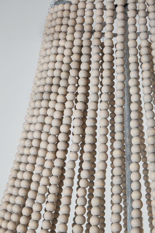 6-light chandelier with several tiers of wooden sticks on curved iron arms all in a whitewash finish. The wooden dowels are placed atop pliable arm...