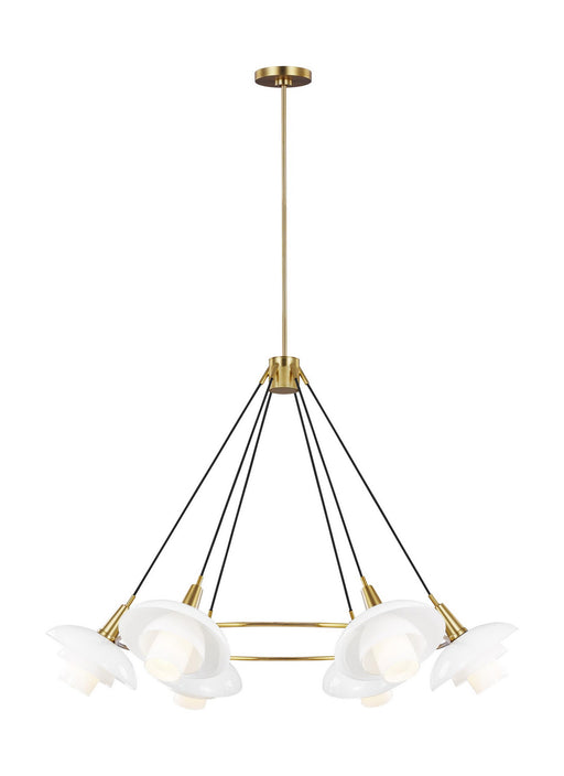 The Rossie six light single tier chandelier in Burnished Brass from Ellen DeGeneres features hand blown stacked individual layered milk glass shade...