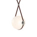 The Derby Large Pendant, part of the 2020 Derby Collection, features a substantial 14" glass globe encasing an LED lighting element, elegantly suspended with artisanally-crafted leather straps from a local New England master, featuring beautiful brass fasteners and buckles, with brass fittings emblazoned with the HF maker's mark. Also available in Small and Multi-Pendant versions, as well as Semi-Flush and Sconce options. Leather is offered in a choice of British Brown or Chestnut.