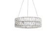 Aircraft cable suspended pendant with a double circular ring of diamond cut clear crystal glass and circular Chrome canopy. The inner chassis combines with the double-layer crystal ring and concealed LED arrays to form a crisp, elegant appearance bridging classic old-world and modern minimal design elements. 20 inches in diameter - the smallest in a series of four sizes.