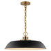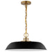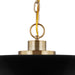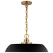 Designed with neutral, clean lines the Colony medium hanging pendant is ideal for an eat-in kitchen, dining room and even a bedroom. The loft-style shallow pan metal shade is finished in matte black, with a white interior to reflect the downfacing lamp. The burnished brass finish on the base, chain, and canopy adds an elegant touch to this flexible design.