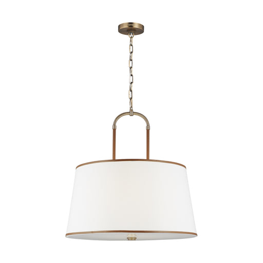 The Katie four-light shade pendant leather straps contrast with metal and white linen fabric shade to round out a timeless design. Available in: Ti...