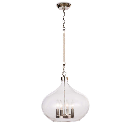 In the Dover pendant, a glass raindrop-shaped shade encases four candelabra bulbs, held in place by a polished nickel frame. Wrapped rope on a port...